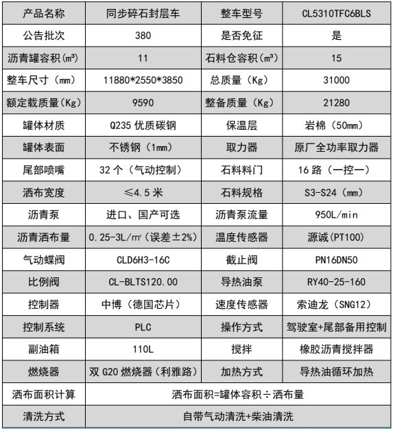 ??????湖北程力汽車:程力CL5310TFC6BLS型陜汽德龍前四后八瀝青碎石同步封層車產品型號及參數配置,程力CL5310TFC6BLS型陜汽德龍前四后八瀝青碎石同步封層車高清圖片,程力汽車系列程力CL5310TFC6BLS型陜汽德龍前四后八瀝青碎石同步封層車最新報價請撥打客服熱線。車輛主要配置 產品商標 程力牌 公告批次 382(擴展) 產品名稱 同步碎石封層車 產品型號 CL5310TFC6BLS 總質量(Kg) 31000 罐體容積(m3) 額定載質量(Kg) 9590,9525 外形尺寸(mm) 11080,11280,11880 × 2550 × 385...