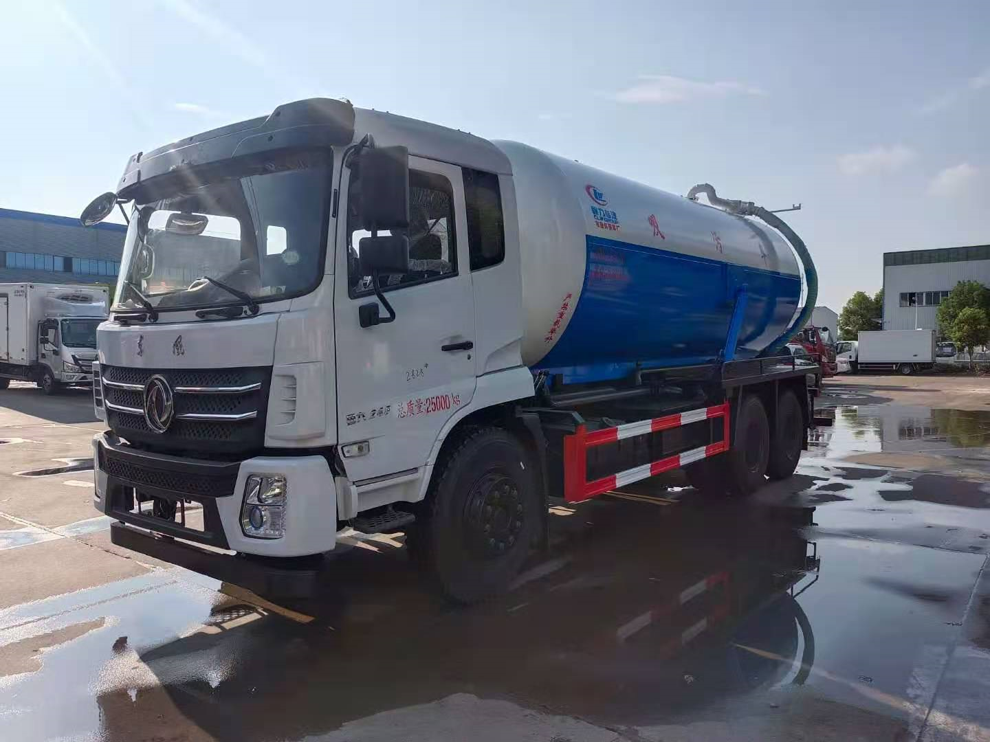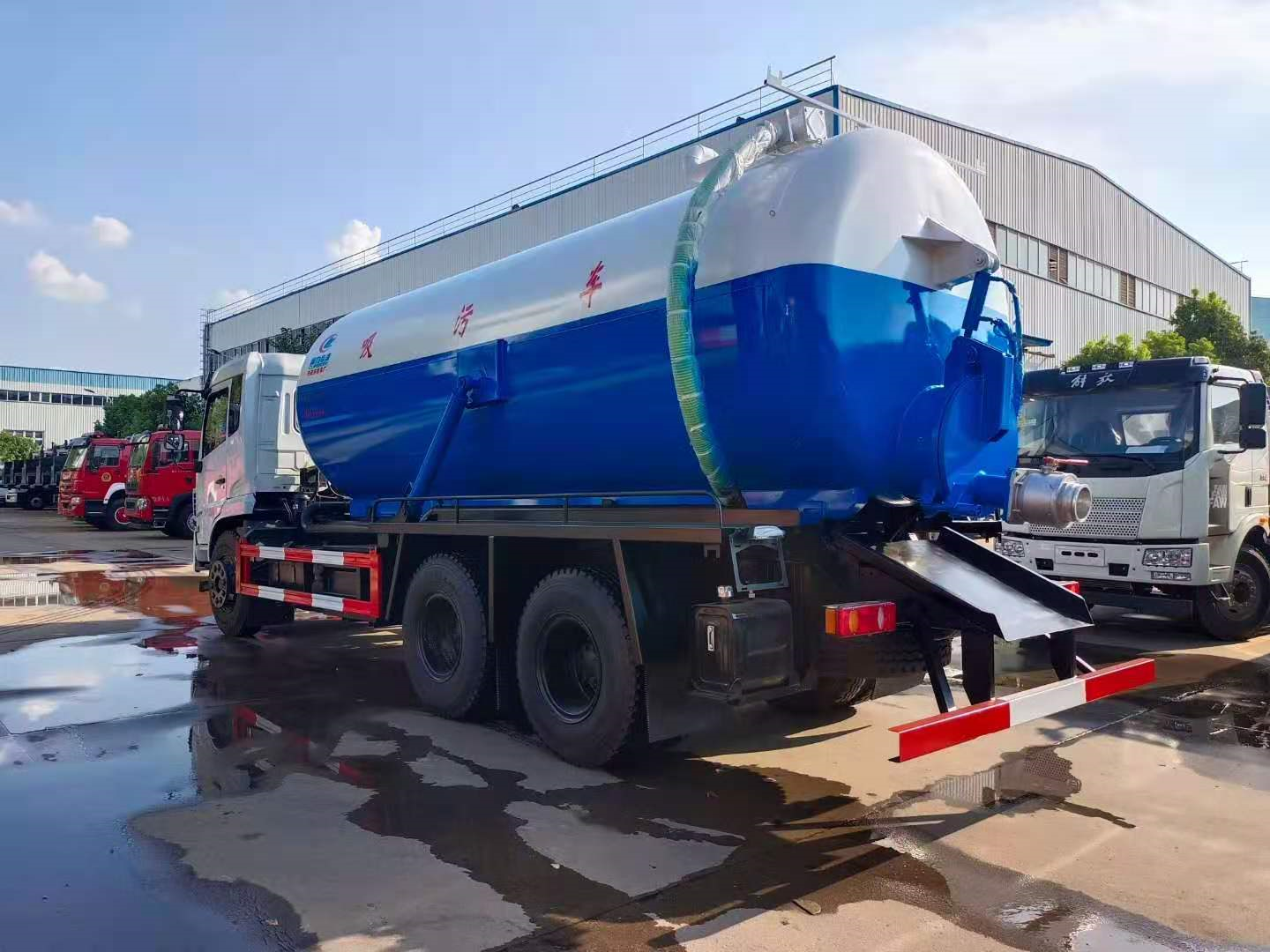 上裝配置 污罐:Q235武鋼6MM厚碳鋼板,標配采用億豐2BE-204水循環泵,防溢閥,視糞管,配一根8米吸污管,罐體封頭一次壓鑄成型、罐體帶舉升,后蓋為液壓開啟。罐內污物可通過后蓋直接傾倒,具有真空度高、噸位大、效率高、用途更廣泛的特點。